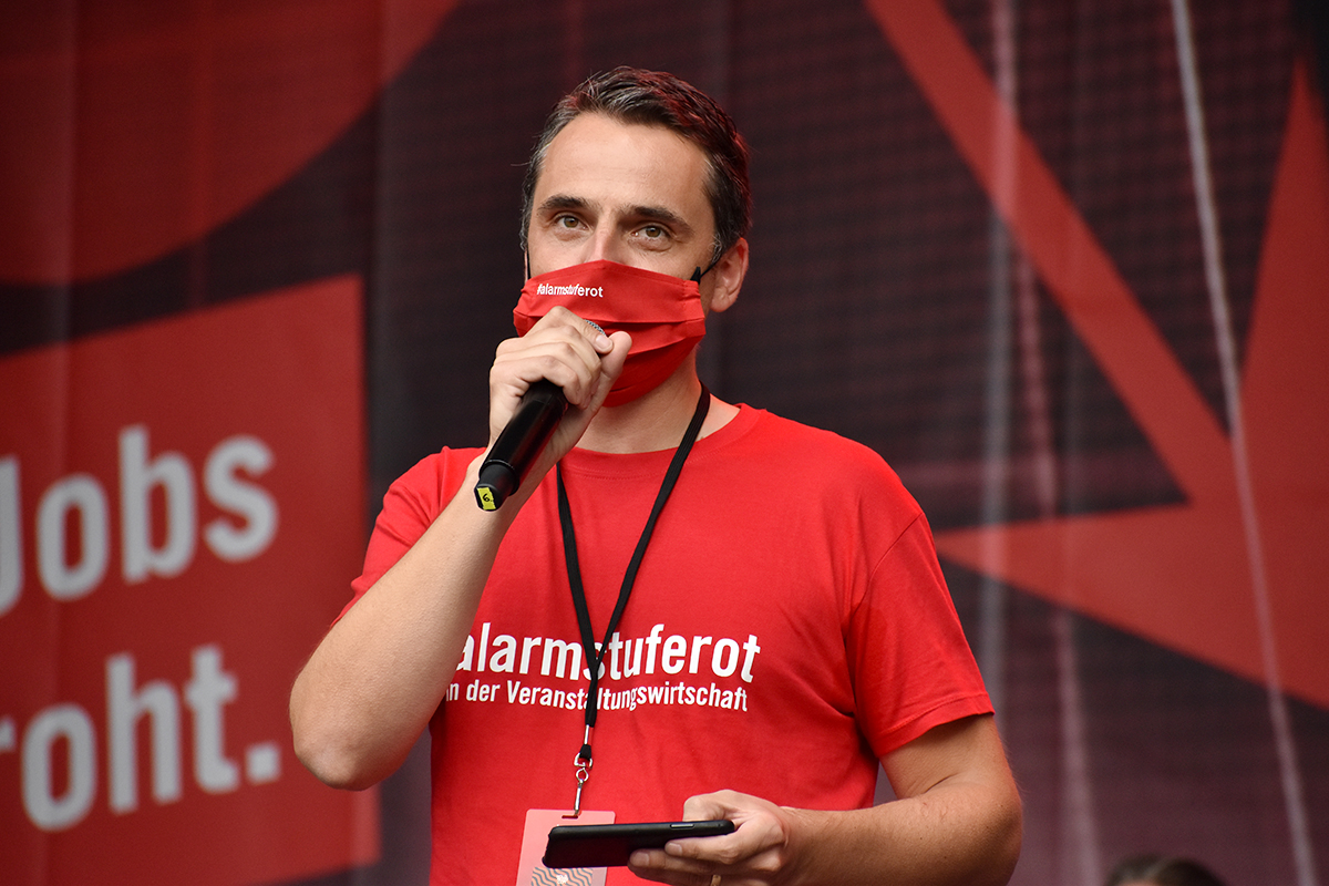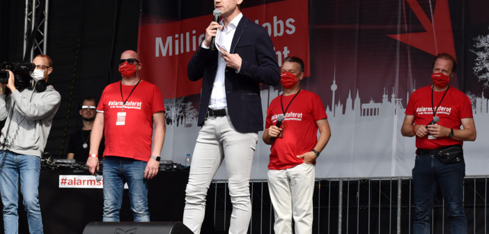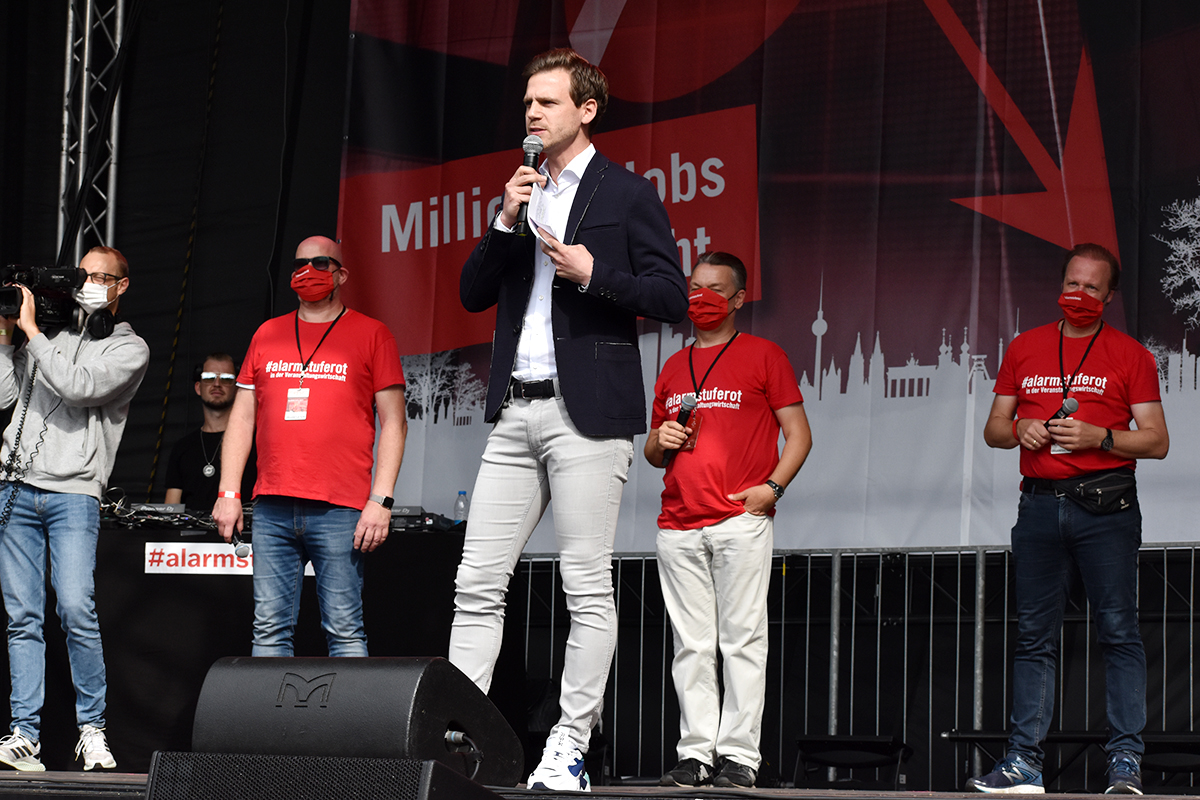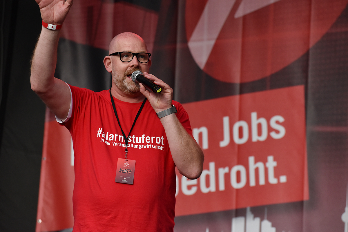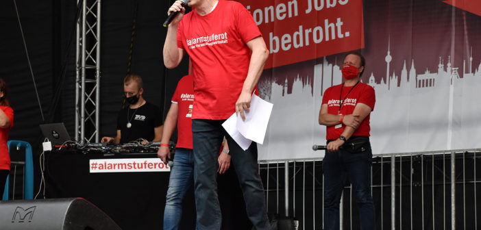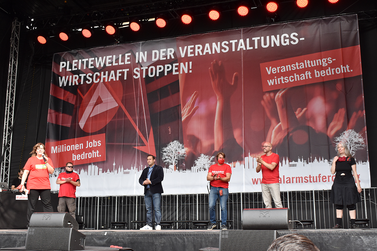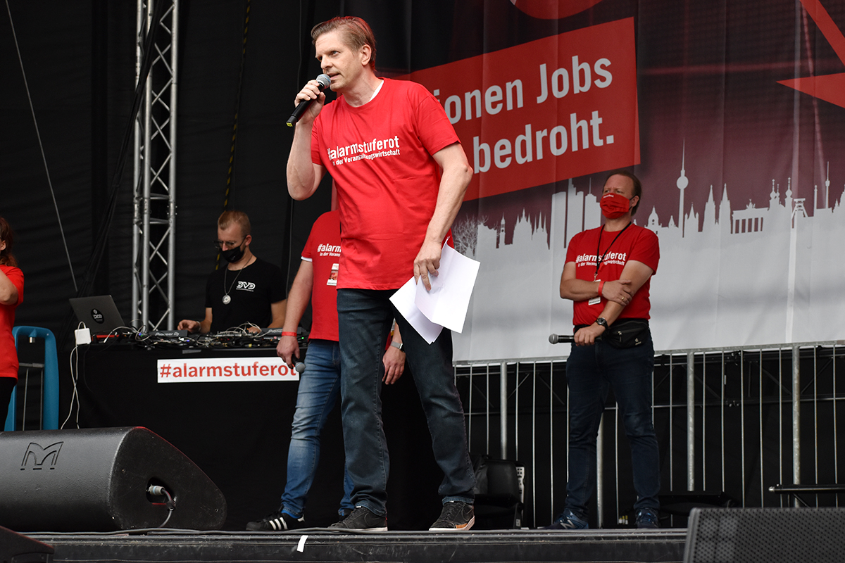Das Programm auf der großen Bühne am Brandenburger Tor war ein weiteres Beispiel höchst professioneller Vorbereitung und Durchführung. Neben den Initiatoren selbst, die das Anliegen der Veranstaltungswirtschaft nochmals eindringlich darlegten und an die Bundesregierung appellierte kamen auch Künstler und Politiker fast aller politischen Parteien zu Wort. So zeigten Künstler wie Stereoact, Mia Julia, Herbert Grönemeyer, Kathrin Hoffmann und The Boss Hoss mit ihrer persönlichen Präsenz ihr Support und ihre Anteilnahme für die verzweifelte Situation der gesamten Branche. Durch das Programm führte der aus zahlreichen TV-Produktionen bekannte Moderator Aljoscha Höhn. Er moderierte u.a. diejenigen Politiker an, die sich nach dem Dialog am Reichstag –zu dem die Initiative #AlarmstufeRot extra einen großen Verhandlungstisch aufgestellt hatte– bereiterklären, auf der Bühne zu den Demonstranten zu sprechen. Dies waren u.a. Falko Mohrs (MdB, SPD), Carsten Müller (MdB, CDU/CSU), Klaus Ernst (MdB, Die Linke) Vorsitzender des Bundesauschusses für Wirtschaft und Energie, Kai Wegner (MdB, CDU), Lars Klingbeil (MdB, Generalsekretär SPD), Sabine Poschmann (MdB) stellv. wirtschaftspolitische Sprechering Bundestagsfraktion SPD), Katrin Göring-Eckardt (MdB, Fraktionsvorsitzende B’90/Die Grünen), Georg Kössler (MdB, Clubpolitischer Sprecher B’90/Die Grünen), Caren Lay (MdB, stellv. Fraktionsvorsitzende Die Linke), Reinhard Houben (MdB, wirtschaftspolitischer Sprecher FDP Bundestagsfraktion), Bernd Riexinger (MdB, Parteivorsitzender Die Linke), Diether Dehm (MdB, Die Linke).