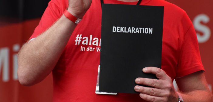 Fast pünktlich gegen 18:00 Uhr wurde die Demonstration vom Demo-Anmelder Dirk Wöhler offiziell beendigt, jedoch nicht ohne das den Vertretern der wichtigsten Verbände der Branche vom Initiator der #AlarmsufeRot Christian J. Eichenberger (CEO Party Rent Group AG) die ausgearbeitete Deklaration überreicht wurde, mit der Order, die darin enthaltenen sechs konkreten Forderungen im Dialog mit der Politik umzusetzen. Falls die Bundesregierung diesen Dialog nicht ausreichend nachkommen sollte, hat Dirk Wöhler am 07.10.2020 bereits die nächste Großdemo in Berlin angemeldet. Der Druck ist also vorhanden, nun müssen Taten folgen!