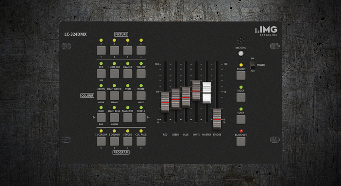 Das Lichtsteuerpult LC-324DMX dient zur einfachen, unabhängigen DMX-Steuerung von bis zu vier LED-Scheinwerfern oder Scheinwerfergruppen mit gleichen Kanalfunktionen. Es können Scheinwerfer mit 3–8 DMX-Kanälen verwendet werden. Das Pult unterstützt folgende Scheinwerferfunktionen: RED = Helligkeit der roten LEDs GREEN = Helligkeit der grünen LEDs BLUE = Helligkeit der blauen LEDs WHITE = Helligkeit der weißen LEDs MASTER = Gesamthelligkeit (Dimmer) STROBE = Stroboskopeffekt Hinweis: Welche Funktionen tatsächlich verfügbar sind, hängt vom Scheinwerfertyp ab. Für jeden Scheinwerfer lässt sich am Steuerpult eine von 12 voreingestellten Farben wählen oder eine individuelle Farbmischung über die Regler einstellen. Zusätzlich bietet das Pult zwei Farbwechselprogramme mit wählbarer Geschwindigkeit, die über das integrierte Mikrofon auch musiksynchron ablaufen können, und ein Programm mit Farbüberblendungen. Über das Stroboskop-Programm ist ein Stroboskopeffekt auch mit Scheinwerfern möglich, die nicht über eine eigene Stroboskopfunktion verfügen.