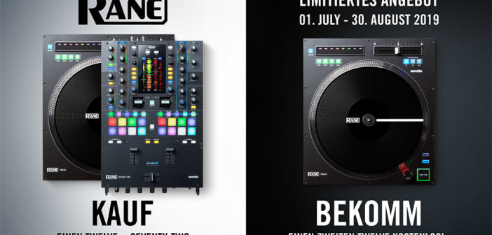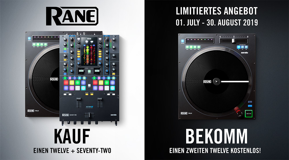 Wer zwischen dem 1.Juli und 30. August 2019 zugreift, kann richtig sparen! Für eine begrenzte Zeit bietet RANE ein phänomenales Angebot für ein professionelles DJ-Setup. Kaufe einen SEVENTY-TWO Mixer und einen TWELVE zwischen dem 01.07.2019 und dem 30.08.2019, und du erhältst einen zweiten TWELVE GRATIS!
